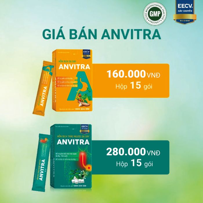 – Một hộp Thực phẩm bảo vệ sức khỏe Hỗn dịch trào ngược dạ dày Anvitra có giá: 280.000 VNĐ / Hộp 15 gói